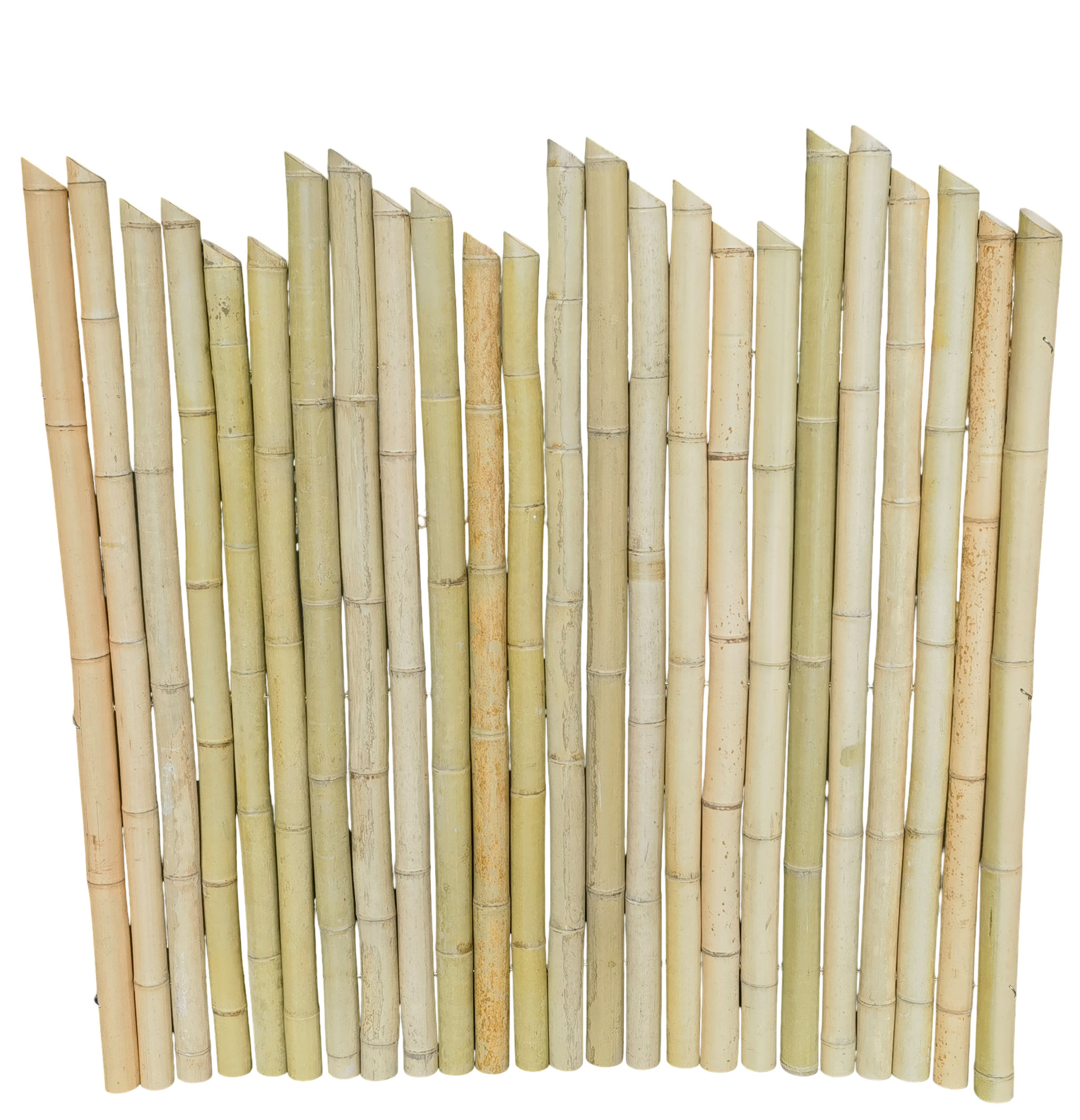 Spear top bamboo fence are popular for blending security with traditional classic style. It offering a deterrent to intruders with their pointed tops while adding elegance to homes, schools, and businesses, it is hand make with enviromental friendly bamboo material. They're versatile, available in various heights and designs (like standard or staggered), and provide a traditional yet functional look for residential perimeters, pools, and commercial properties. Taller bamboo fence are commonly used as privacy fence and he shorter bamboo poles fences used to outline flowerbeds or add charm. They are also used as border fence to define property line or sections. We offer them in 24", 36", 48", 60", 72" high by 48"long section. We used 2" to 2.25" diameter yellow bamboo or carbonized black bamboo. They are hand strung together with galvanized steel wire. They are shipped in compact roll up form. Available in single or double poles style. Key Benefits